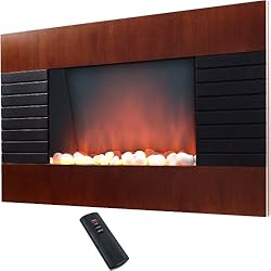 Features include: Wall mounted mahogany effect wooden style electric wall fireplace Flame effect with under-bed glow 750 and 1500-Watt heat settings Safety thermal cut-off built-in to prevent overheating Adjustable flame brightness Remote control with ON/OFF, 750-Watt and 1500-Watt selection, flame dimmer Remote control requires two AAA batteries (not included)Mounting hardware included allows you to mount this incredible fireplace right to your wall Pebbles included Instruction manual Dimensions: 625 x 35375 x 22-Inch Fire Window Dimensions: 20 x 1175-InchTwo prong power cord is 70-Inch long
